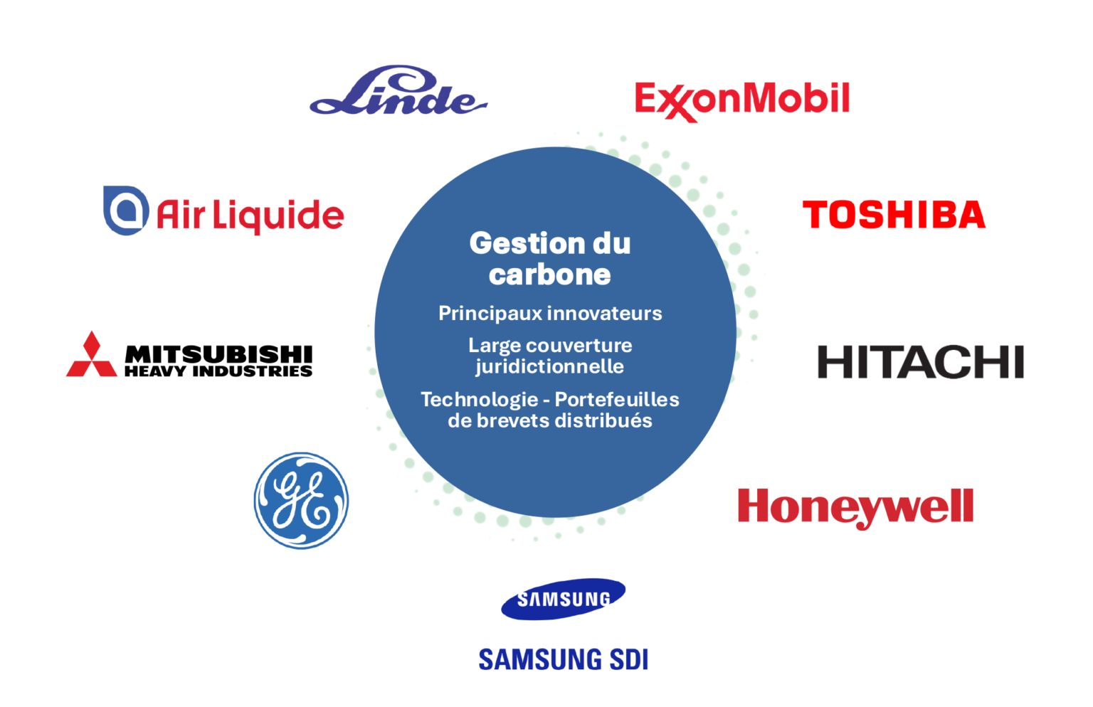 L’examen des portefeuilles de brevets d’acteurs clés tels que Mitsubishi, Air Liquide, Linde et Exxon Mobil peut donner un aperçu des stratégies de propriété intellectuelle fructueuses ainsi que des risques associés à cet espace. Il s’agit d’acteurs mondiaux bien positionnés dans le domaine de la gestion du carbone, qui disposent de vastes portefeuilles et de produits couverts par des brevets. Ces acteurs figurent également parmi les principaux déposants de brevets pour les différentes technologies de gestion du carbone, comme indiqué dans les sections précédentes.