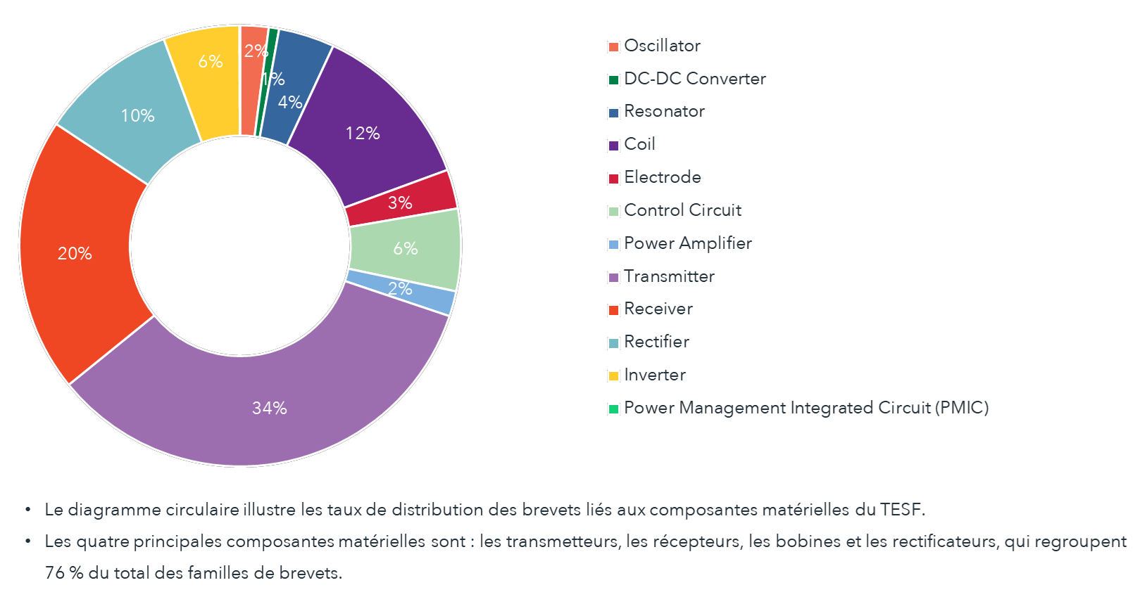 Samsung et State Grid Corp, de la Chine, sont à la tête du secteur du transfert d’énergie sans fil. LG, Panasonic, Qualcomm, Toyota, BBK, Apple et Philips font partie des principaux dépositaires de brevets du milieu du TESF. On a découvert lors de l’étude que les dépôts de brevets de Qualcomm ont commencé à baisser à partir de 2017, notamment à cause de la vente de Halo, sa technologie de recharge sans fil des véhicules électriques, à WiTriCity, une entreprise dérivée du Massachusetts Institute of Technology (MIT).