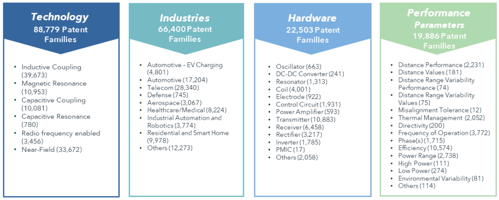 Granted patents or patent applications have been included in multiple categories wherever applicable and possible. For example, a patent claim reciting inductively coupled charging and magnetic resonance charging for an electric vehicle is marked in categories – Inductive Coupling and Magnetic Resonance (i.e., technology nodes) and in Automotive – EV charging (Industry). This shows the overlap between different taxonomy nodes (i.e., Technology and Industry in this example).